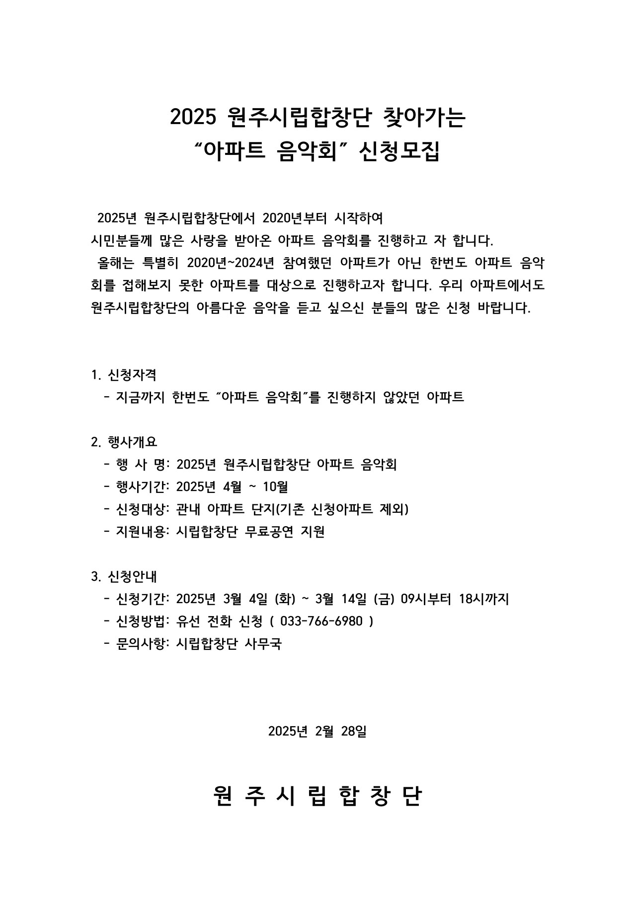 원주시립합창단 아파트음악회 신청안내문