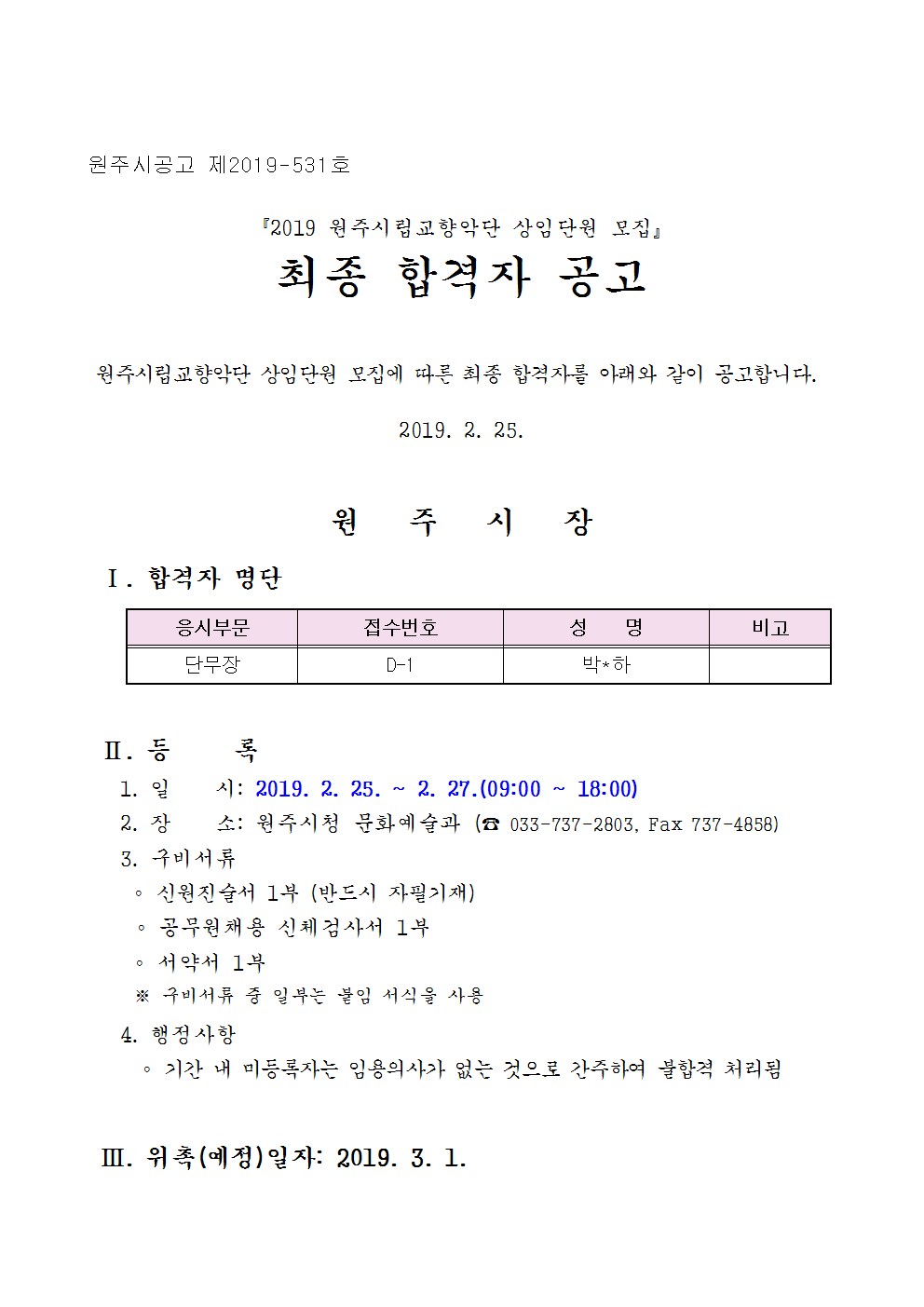 "원주시립교향악단 2019 상임단원 채용" 최종 합격자 공고