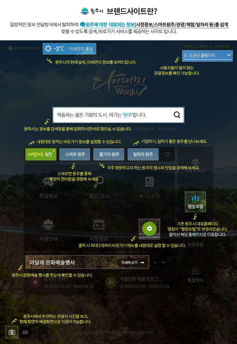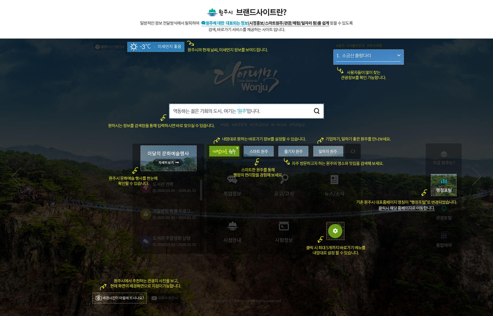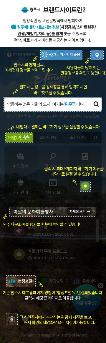 일방적인 정보 전달방식에서 탈피하여 원주에 대한 대표되는 정보(시정홍보/스마트원주/관광/체험/일자리 등)를 쉽게 찾을 수 있도록 검색, 바로가기 서비스를 제공하는 사이트입니다.