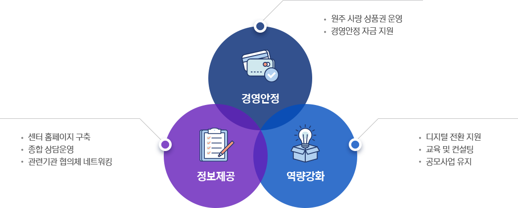 원주시 소상공인종합정보센터는 소상공인의 접근성과 현장성을 고려하여 원주 구도심의 인접지에 구축함으로써 소상공인과 더욱 가깝게 소통하기 위해 노력하고 있습니다.
