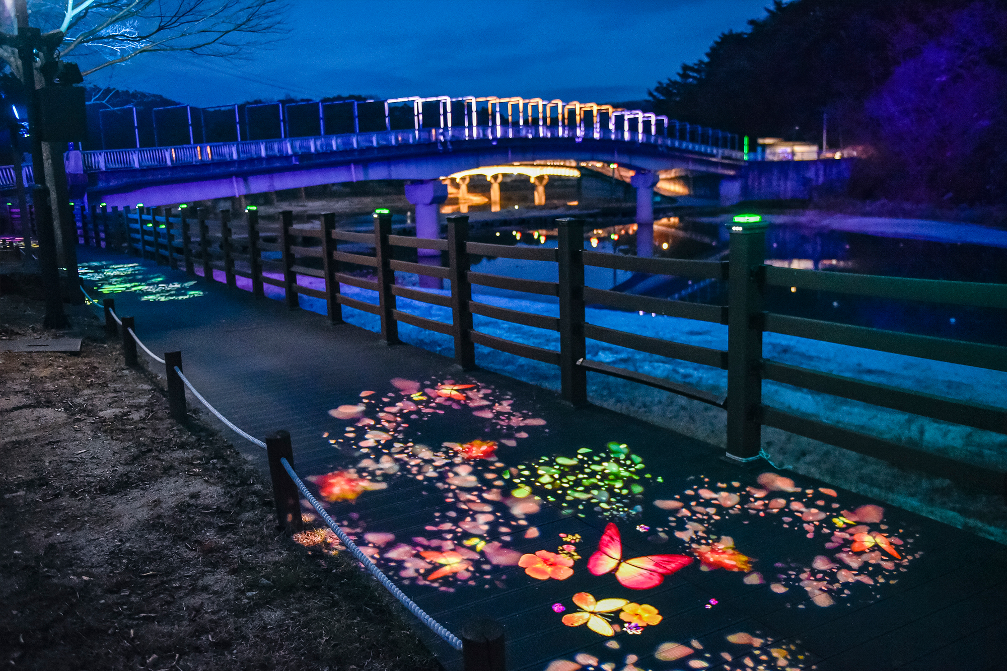 삼산천교를 따라 레이저, 안개분수, 빛의 터널이 만들어내는 환상적인 빛의 쇼. 폐자재에 생명을 불어넣어 탄생한 생명의 나무 미디어아트